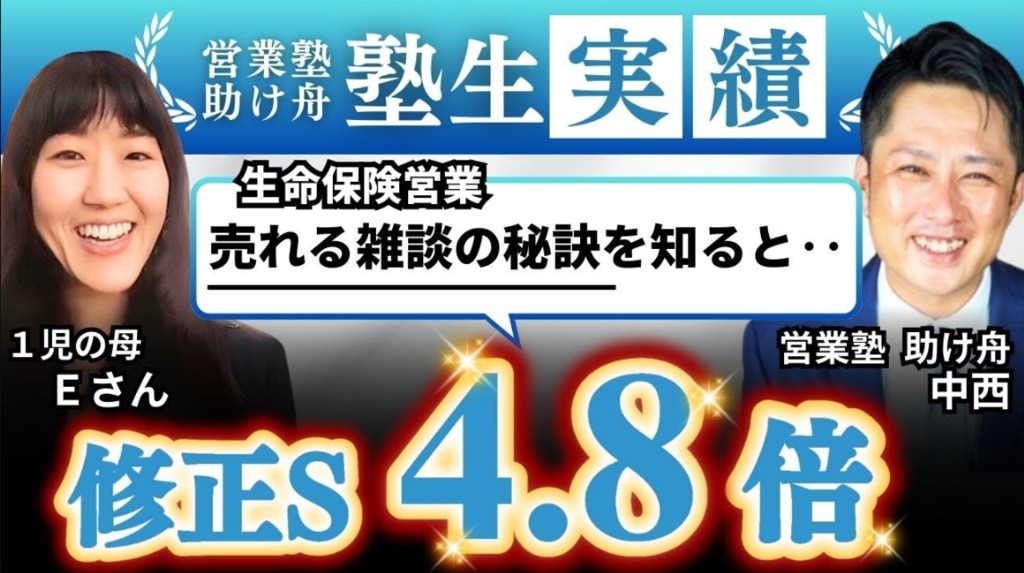 【修正S 4.8倍!】入塾直後から劇的変化!雑談の学び直しで愛され営業へ|営業塾 助け舟 塾生さんインタビュー生命保険営業塾生さんの声口コミ相談者さんインタビュー2025-10-06 01:00中西 龍一